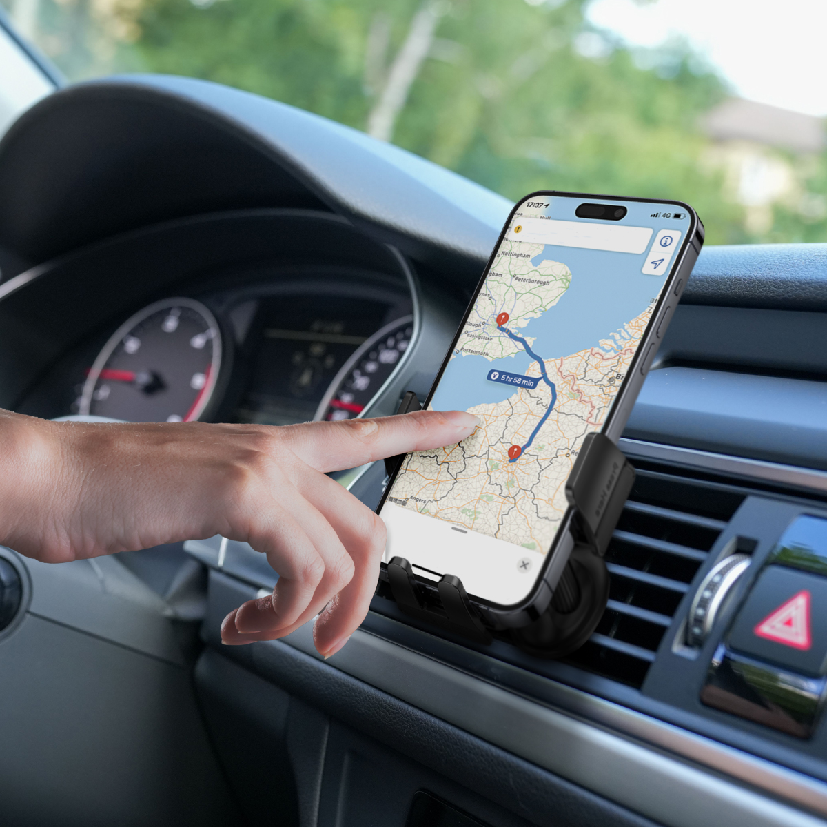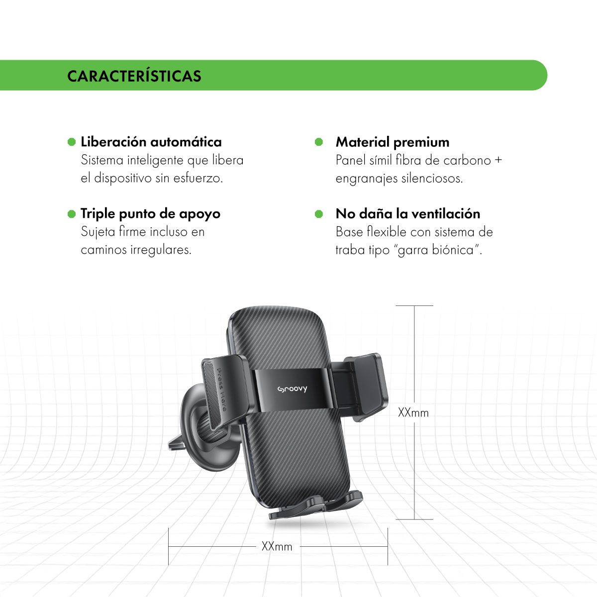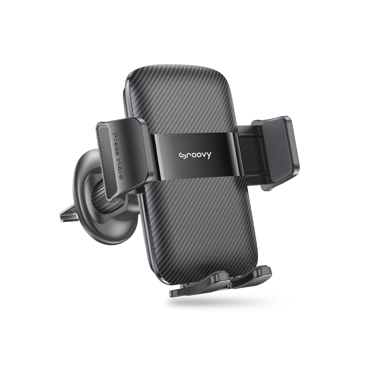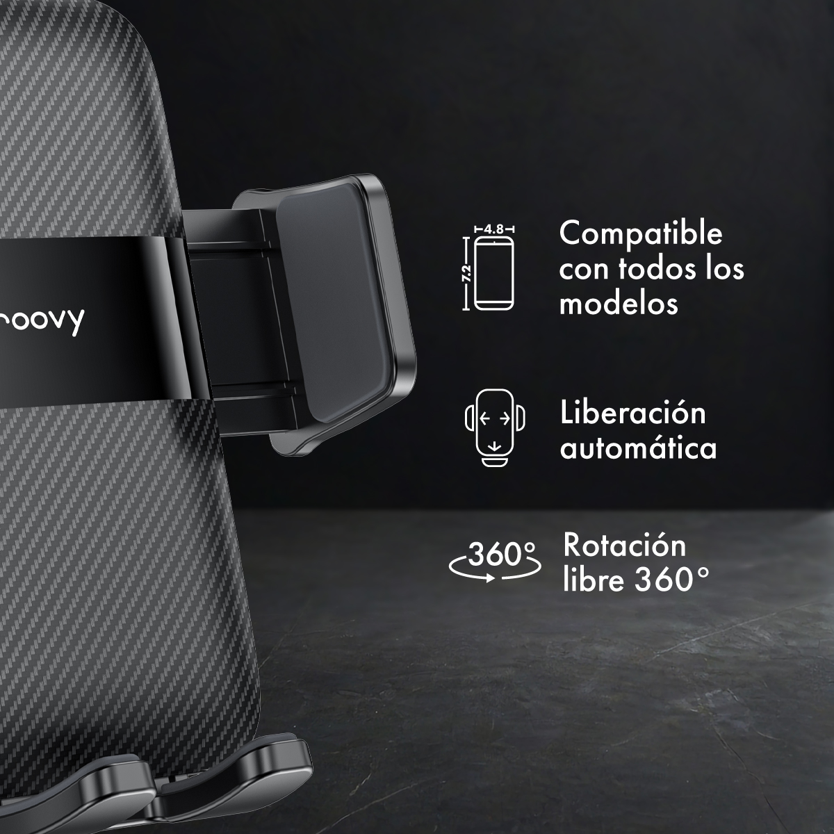 Este soporte compacto con acabado en fibra de carbono se fija de forma segura en la ventilación del vehículo gracias a su traba tipo garra.