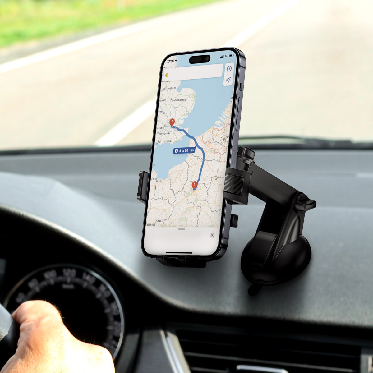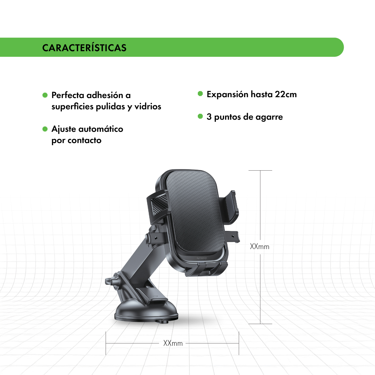 Nuestro soporte con base de ventosa ultra adherente se fija firme al parabrisas o tablero para que tu celular viaje seguro, sin vibraciones ni movimientos.